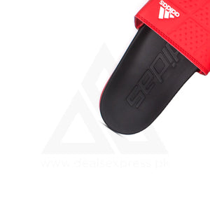 Designed for athletes who demand both performance and style, these slides feature a striking red perforated upper with crisp white three-stripe branding, paired with a premium black Cloudfoam footbed. The vibrant red outsole with textured tread pattern completes this high-energy colorway that commands attention.